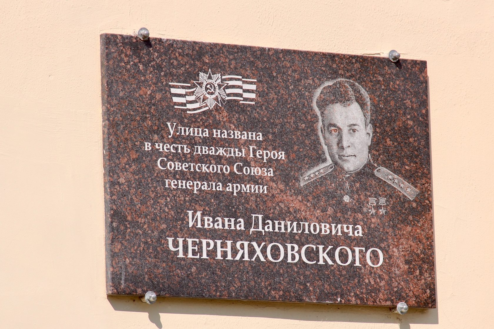 Отметим, что улица названа в честь легендарного полководца, Советского военачальника, дважды Героя Советского Союза, генерала армии Ивана Даниловича Черняховского. Один из талантливейших молодых полководцев, выдвинувшихся в ходе Великой Отечественной войны.Наиболее отличившийся на посту командующего 60-й армии и войсками 3-го Белорусского фронта.